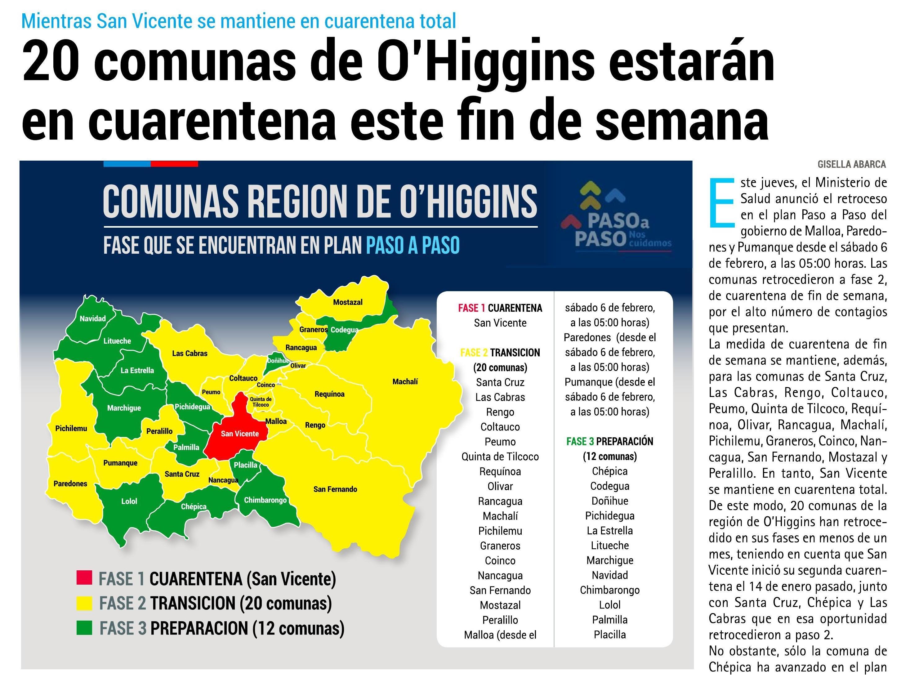 Comunas En Fase 2 Region De Ohiggins : Tres Fallecidos 83 Nuevos Casos De Coronavirus En La Region De O Higgins Y Santa Cruz Entra A Cuarentena : Cada provincia está compuesta por comunas (municipios). . Fases de la región de libertador general bernardo o'higgins. O'higgins es una comuna de chile, ubicada en la provincia capitán prat, la cual a su vez forma parte de la región de aysén del general carlos ibáñez del campo, cuya capital es villa o'higgins. La región del libertador general bernardo o'higgins está formada por las provincias de cachapoal, cardenal caro y colchagua. Puedes ir a trabajar si es que el lugar de trabajo no está en una comuna en cuarentena, a no ser que sea servicio esencial, y tengas un permiso de desplazamiento colectivo o un permiso único colectivo. Región de o'higgins), is one of chile's 16 first order administrative divisions.